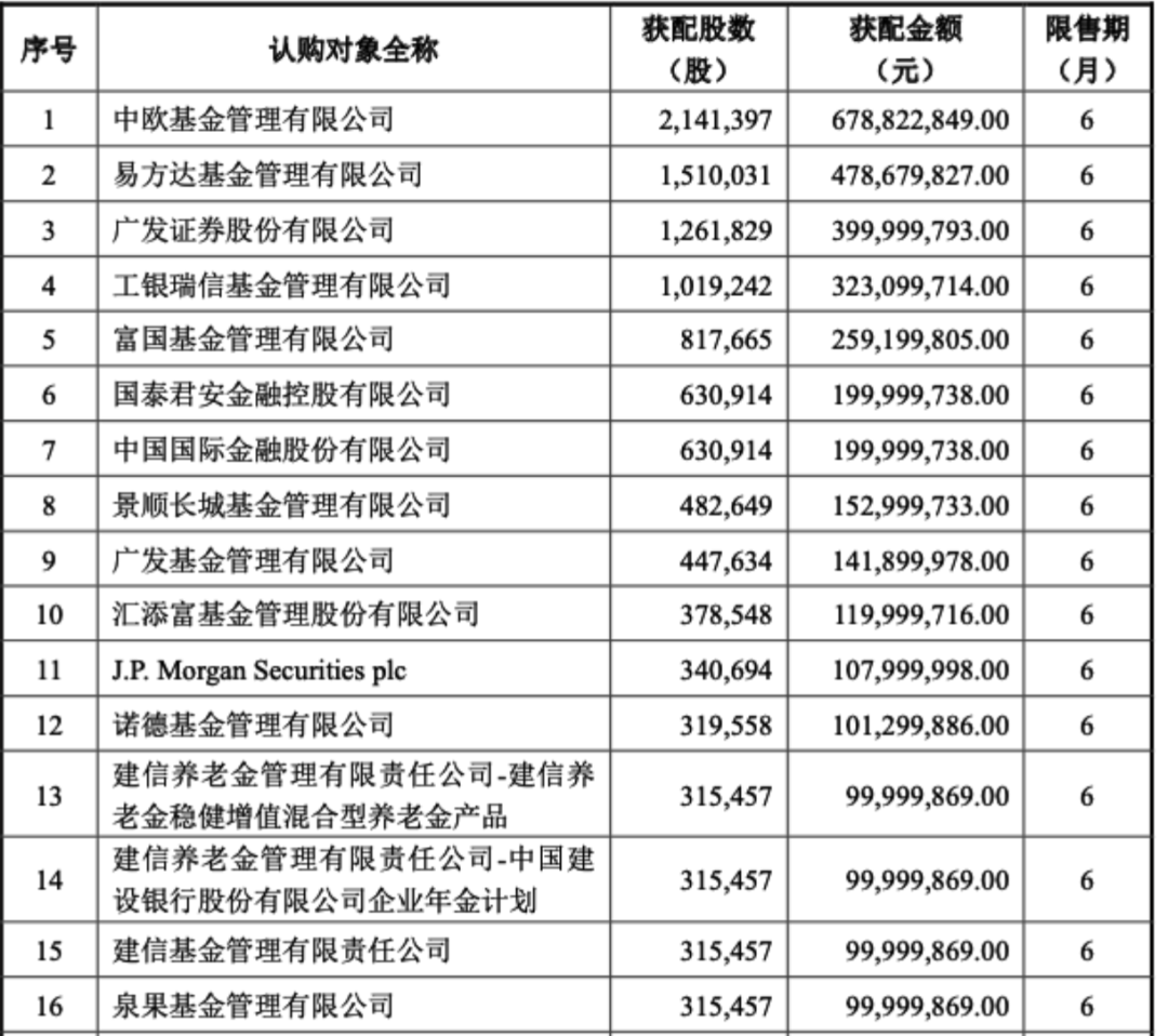 其中,中欧基金获配214.14万股,易方达基金、工银瑞信基金获配股数均超过100万股,富国基金、景顺长城基金、广发基金和汇添富基金分别获配81.77万股、48.26万股、44.76万股、37.85万股。