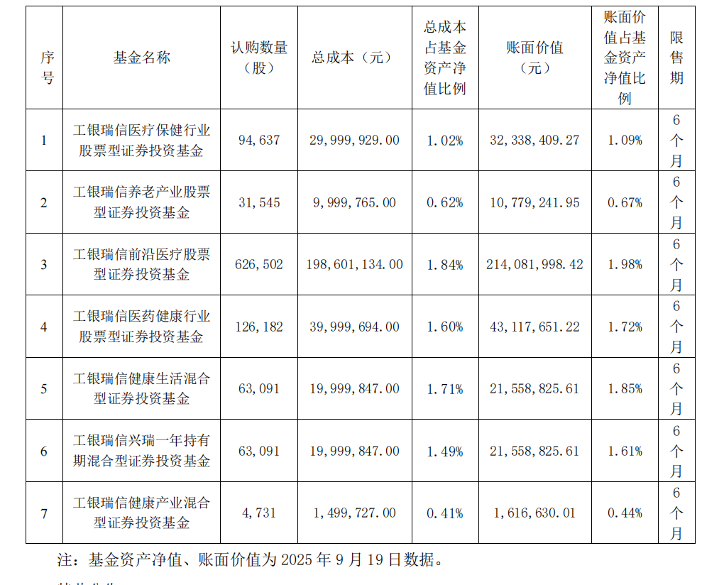 工银瑞信医疗保险行业、工银瑞信养老产业股票、工银瑞信前沿医疗和工银瑞信医药健康分别认购9.46万股、3.15万股、62.65万股、12.62万股融可赢配资,成本合计约为2.79亿元。