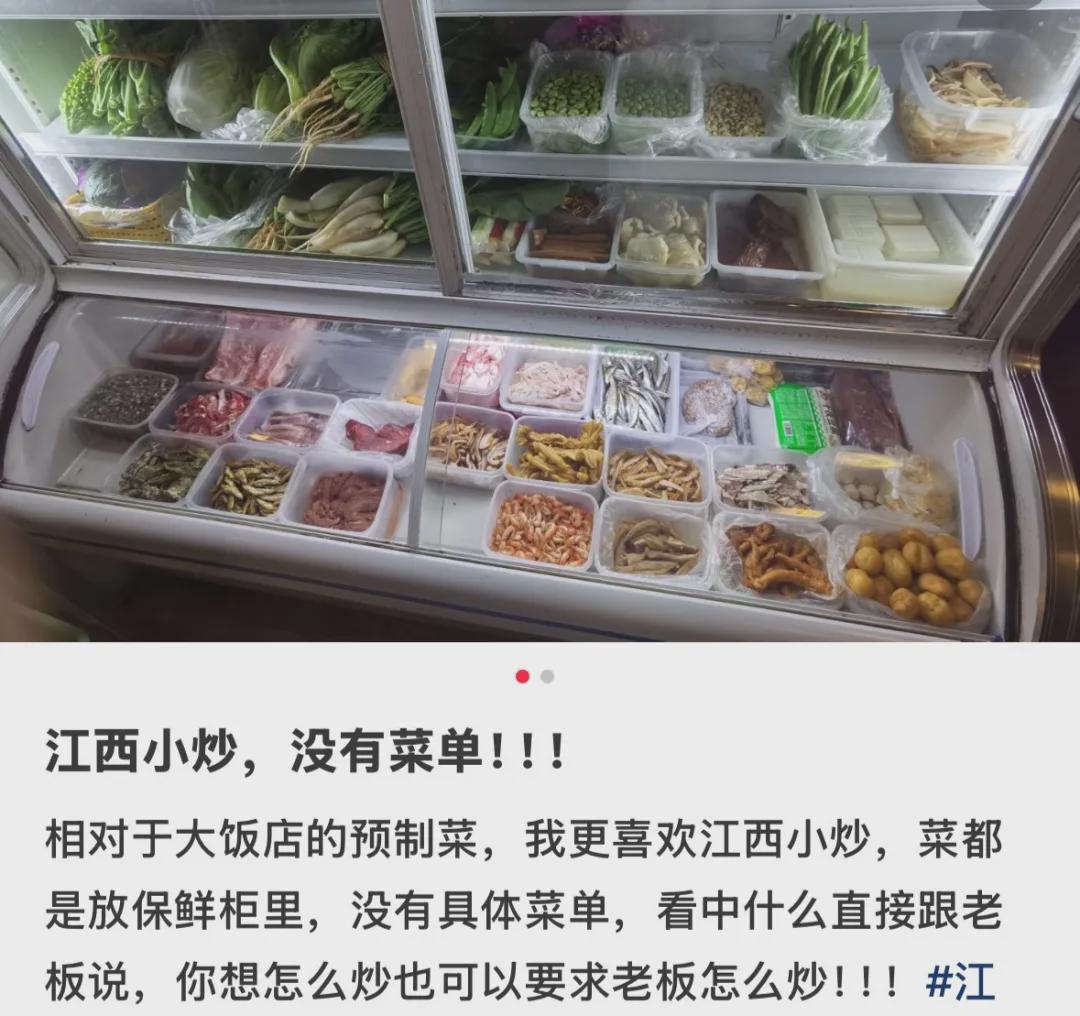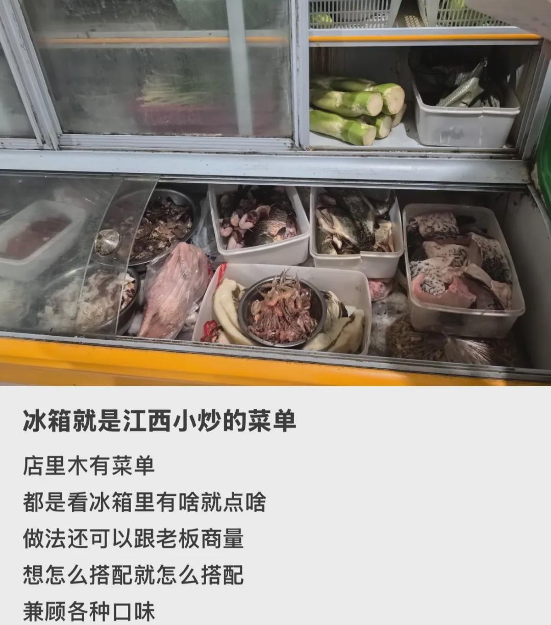 “江西小炒是盲盒式点菜,老板把今天新鲜采购的菜放在冰箱里,客人们指菜下单,新鲜度肉眼可见。吃啥不看你想要啥,而要看老板今天早上在菜市场抢到啥。